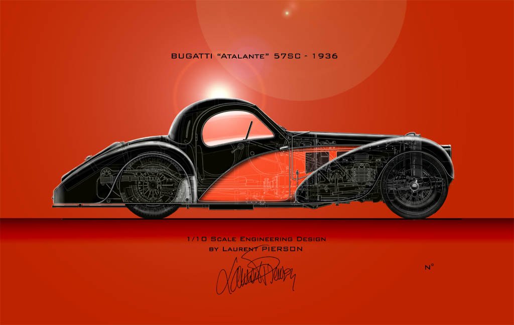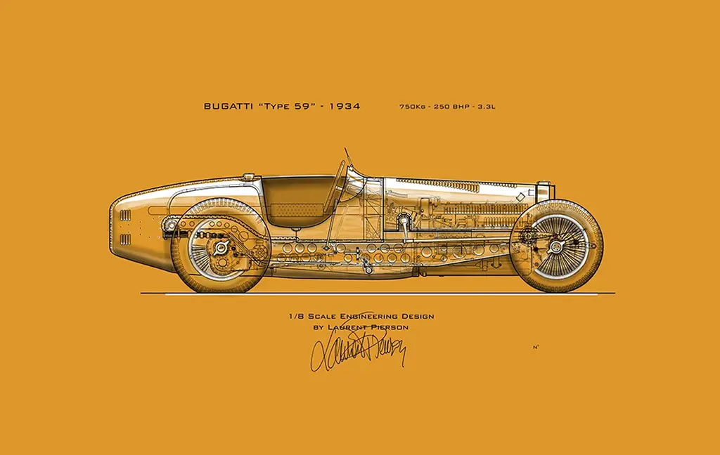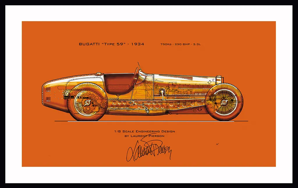 Découvrez notre sélection exclusive de dessins techniques, réalisés par Laurent PIERSON lors de l’élaboration de ses miniatures 1/8. L’ensemble des organes mécaniques de chaque auto, issus des relevés et archives, y sont fidèlement représentés. L’ajout de couleurs et reliefs apportent une expérience artistique et intemporelle.