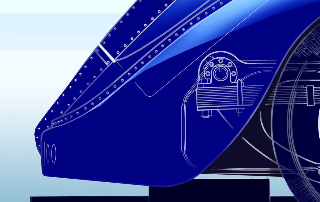 Ce dessin en vue de face, est exécuté exactement à l’échelle des miniatures produites au 1/10e. A la fois technique et artistique, il est l’aboutissement de l’ensemble des recherches et relevés nécessaires à l’élaboration de nos modèles type 57SC Atlantic. Vous y retrouverez, en plus de la silhouette générale, tous les composants mécaniques qui composent cette iconique voiture de course des années 30…